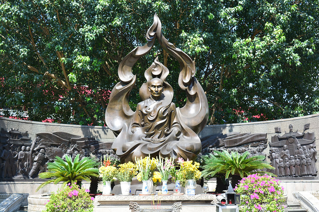 Behind the main statue, a 12-meter bronze relief portrays the 1963 Buddhist crisis and Thich Quang Duc’s enduring act of sacrifice